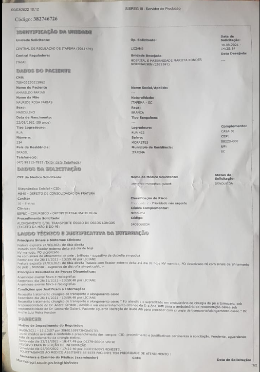NR: Entramos em contato com assessoria da governo e não obtivemos respostas, o espaço segue em aberto para o governo explicar o porque um paciente está na fila de espera apodrecendo em uma cama a espera de uma cirurgia ortopédica por mais de um ano, a beira da morte?