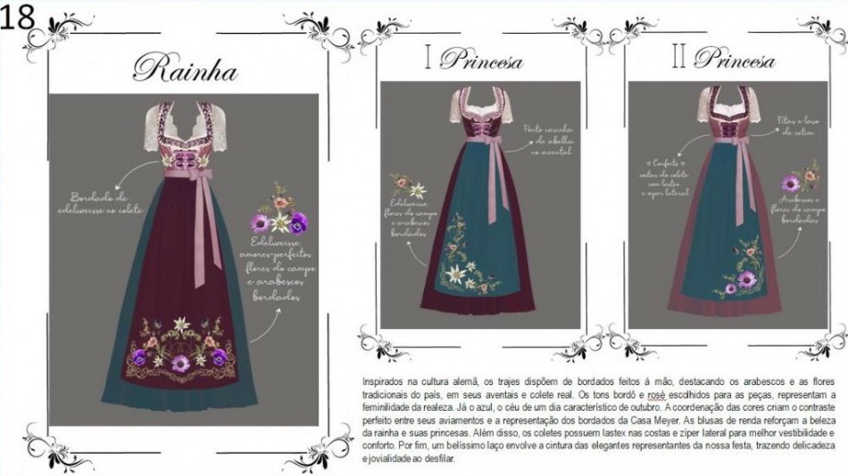Pela primeira vez, o Parque Vila Germânica estipulou que os trajes fossem desenvolvidos dentro de um tema. Trata-se de um bordado típico feito na Casa Meyer, tradicional ponto comercial da cidade em meados do século XIX. Fundada em 1903 por Ricardo Meyer, filho de imigrantes da Alemanha, a Casa Meyer foi pioneira na região, comercializando principalmente porcelanas, cristais e bordados florais.