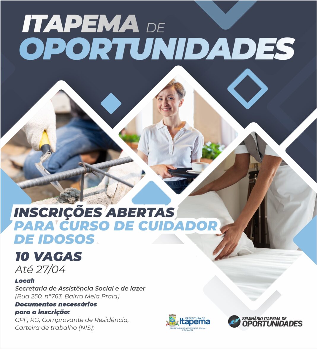 A Secretaria de Assistência Social e de Lazer está com inscrições abertas para os cursos de Cuidador de Idoso do Programa Itapema de Oportunidades de 2023. Os interessados têm até quinta-feira (27/04) para realizar o cadastro na Secretaria de Assistência Social e de Lazer, localizada na Rua 250, nº 763, no Bairro Meia Praia. Para realizar a inscrição é necessário apresentar CPF, RG, Comprovante de Residência e Carteira de Trabalho (NIS). Mais informações pelo WhatsApp (47) 99132-9896