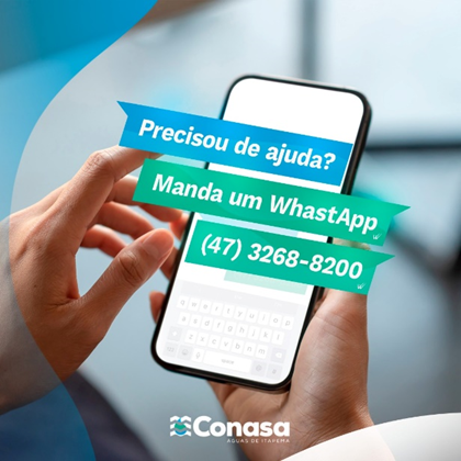 Você já conhece o nosso canal de atendimento via WhatsApp? É muito mais rápido e prático. Acessando o número (47) 3268-8200 poderá solicitar serviços como segunda via de fatura, religação de água (cavalete ou ramal), conserto (cavalete ou ramal), vazamento (água e esgoto) e deslocamento (cavalete ou ramal).