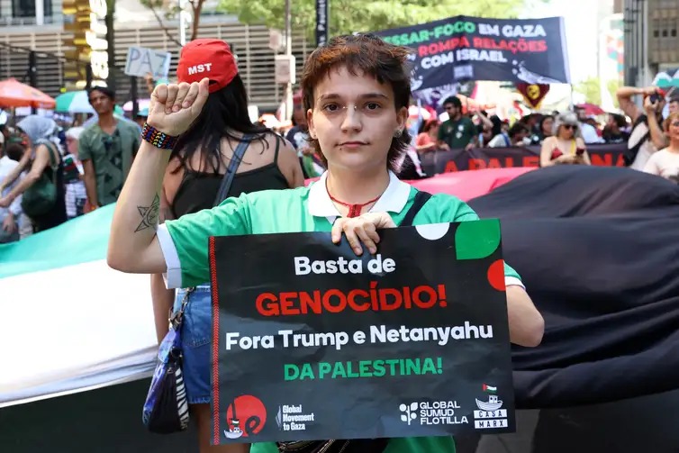 Agência Brasil: – Em mais um ato pró-palestina no centro de São Paulo, alguns milhares de manifestantes demonstraram solidariedade aos ativistas presos nesta semana por Israel enquanto tentavam romper o bloqueio naval imposto à região da Faixa de Gaza. Eles ainda denunciaram a postura violenta da marinha israelense e pediram um posicionamento mais firme do governo brasileiro para garantir a segurança dos 11 nacionais entre as centenas de ativistas detidos.