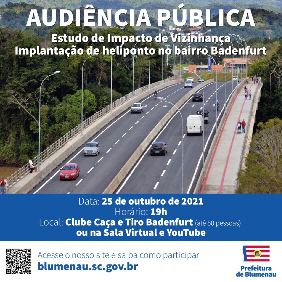 A audiência pública em formato híbrido ocorre no Clube Caça e Tiro Badenfurt, situado na Rua Heinrich Hemmer, limitado a 50 participantes presenciais. A inscrição poderá ser feita pelo formulário disponível no link https://www.blumenau.sc.gov.br/governo/secretaria-de-desenvolvimento-urbano/pagina/eivs-seplan.