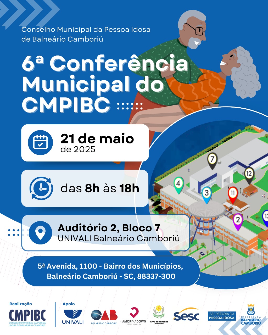 Com o tema “Envelhecimento Multicultural e Democracia: urgência por Equidade, Direitos e Participação”, a 6ª Conferência Municipal dos Direitos da Pessoa Idosa já está com as inscrições abertas. O evento, organizado pelo Conselho Municipal da Pessoa Idosa com apoio da Secretaria da Pessoa Idosa (SPI), será realizado no dia 21 de maio, no auditório da Universidade do Vale do Itajaí (Univali), Campus Balneário Camboriú, das 8h às 18h.