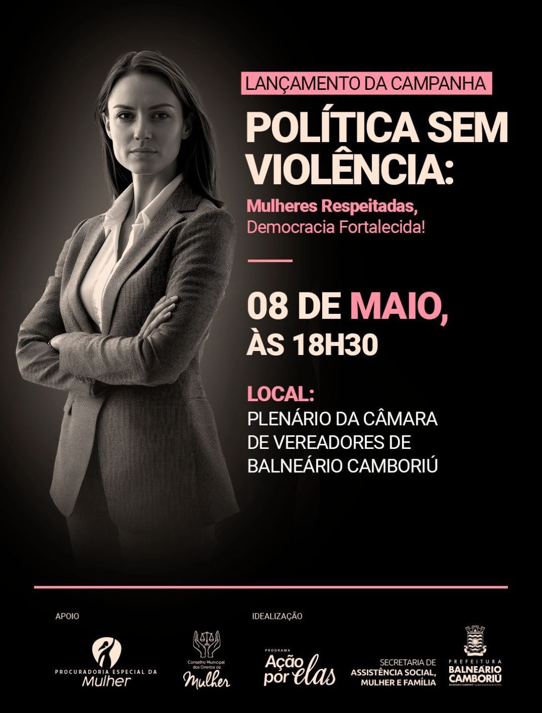 Será realizado dia 8 de maio, às 18h30, no plenário da Câmara de Vereadores de Balneário Camboriú, o lançamento da Campanha de Conscientização sobre Violência Política de Gênero. Idealizada pela Secretaria de Assistência Social, Mulher e Família – por meio do Departamento de Políticas Públicas para as Mulheres -, a ação conta com o apoio da Procuradoria Especial da Mulher da Câmara e do Conselho Municipal dos Direitos da Mulher, unindo forças institucionais em prol da democracia, do respeito e da equidade de gênero.