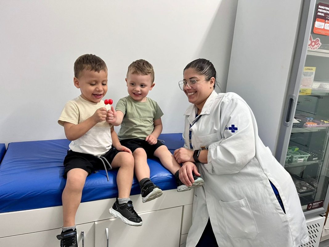 Jonatas Camilo do Carmo Brião, de 31 anos, aproveitou o Dia D para levar os filhos gêmeos, de dois anos, para tomar as vacinas contra a covid-19 e gripe, na UBS Nações. “A gente veio aproveitar o Agito no Bairro e já passamos aqui para deixar as vacinas em dia. É super necessário manter a caderneta atualizada, para cuidar da saúde deles e evitar que tenham problemas futuramente”, comentou.
