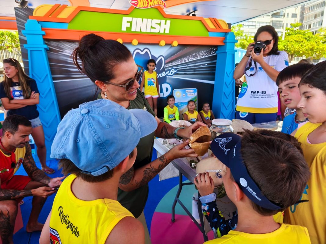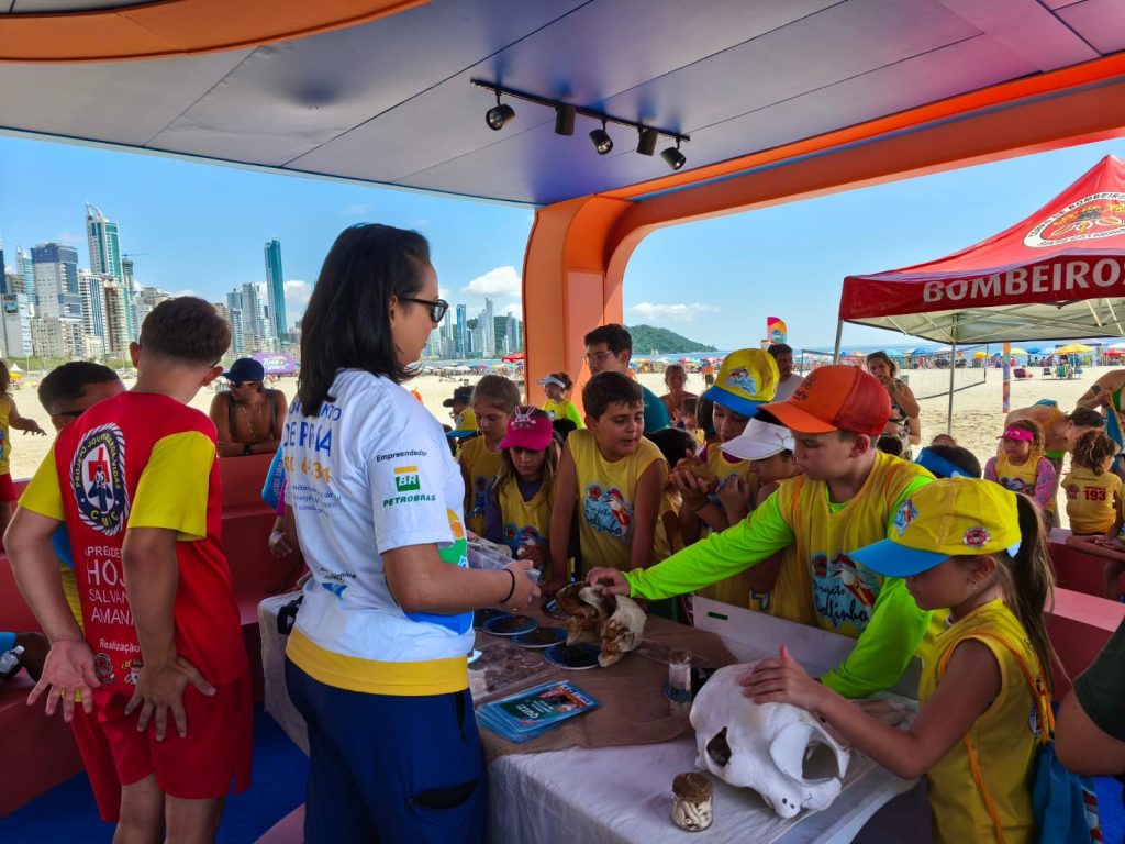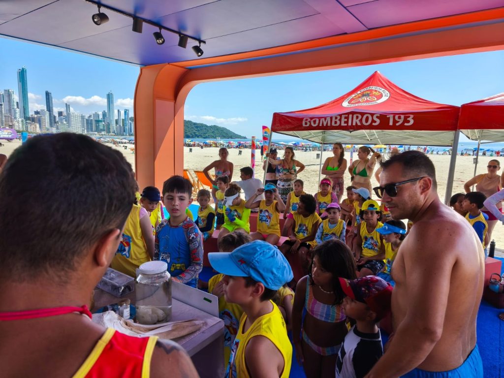 A Praia Central de Balneário Camboriú foi palco, neste sábado (31), de uma série de atividades de educação ambiental. A programação ocorreu na faixa de areia, na altura da Rua 1100, na tenda do Beto Carrero World, entre 9h e 13h, e contou com a participação de mais de 60 crianças inscritas no Projeto Golfinho, desenvolvido pelo Corpo de Bombeiros Militar. Além do público inscrito, frequentadores da praia também foram convidados a participar.