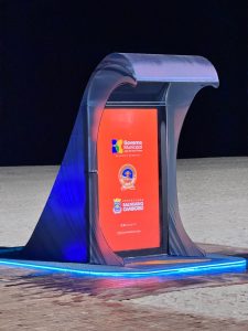 Com 2,4 metros de altura e formato de onda, o equipamento conta com iluminação em LED e um painel de 80 polegadas que apresenta, informativos e vídeos institucionais. Tudo é alimentado por baterias, proporcionando ainda mais economia.