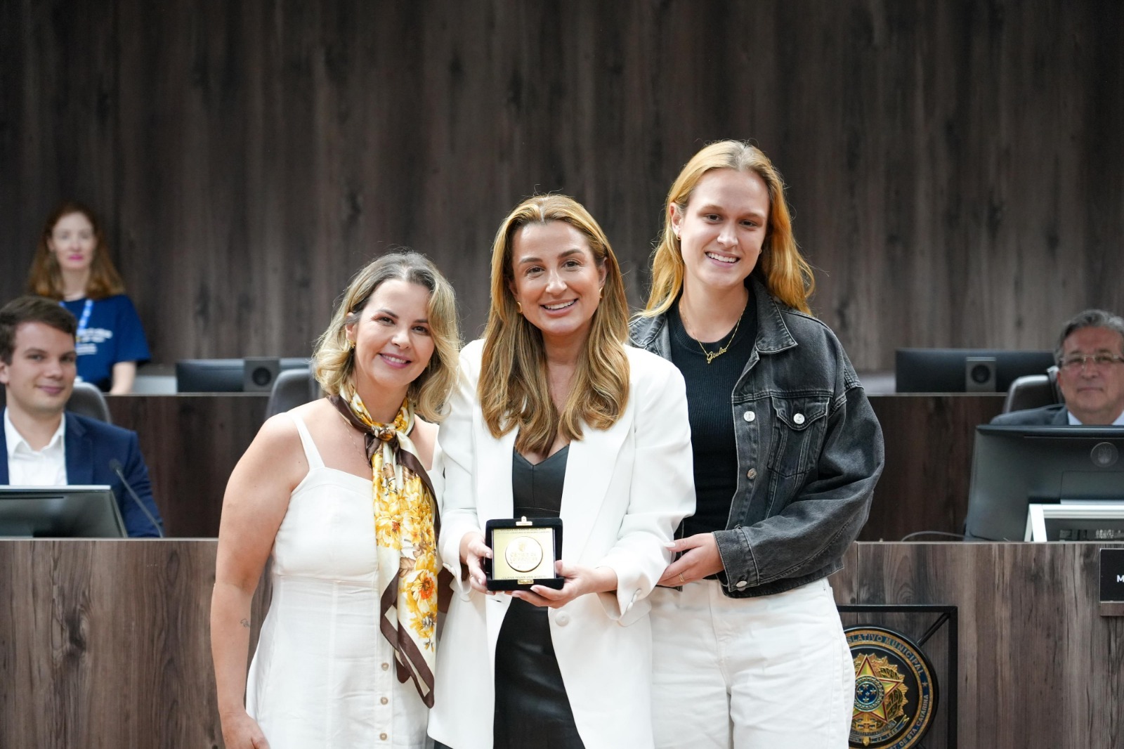 A prefeita de Balneário Camboriú, Juliana Pavan foi uma das homenageadas na Casa Legislativa, indicada pela vereadora suplente, Elaine Nunes Correia, que esteve como vereadora no período de 12 de agosto a 11 de setembro, período de consecução do Projeto de Decreto Legislativo nº 03/2025.