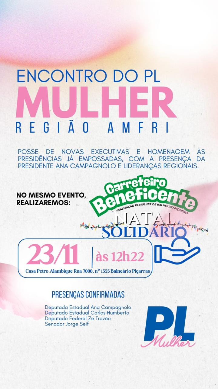 O Partido Liberal (PL) Mulher da Região da Associação dos Municípios da Foz do Rio Itajaí (AMFRI) realiza, no próximo dia 23 de novembro, um encontro regional que ocorre em Balneário Piçarras e vai reunir lideranças políticas e comunitárias de Santa Catarina.