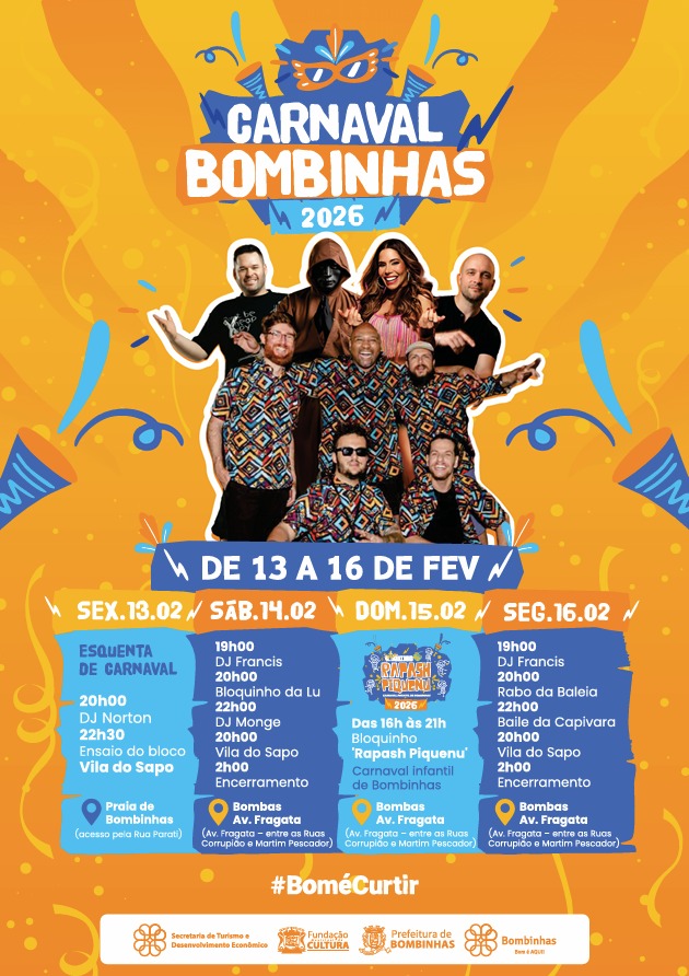 O Carnaval de Bombinhas 2026 é uma realização da Prefeitura Municipal, por meio da Secretaria de Turismo e Desenvolvimento Econômico (Setur) e da Fundação Municipal de Cultura (FMC).