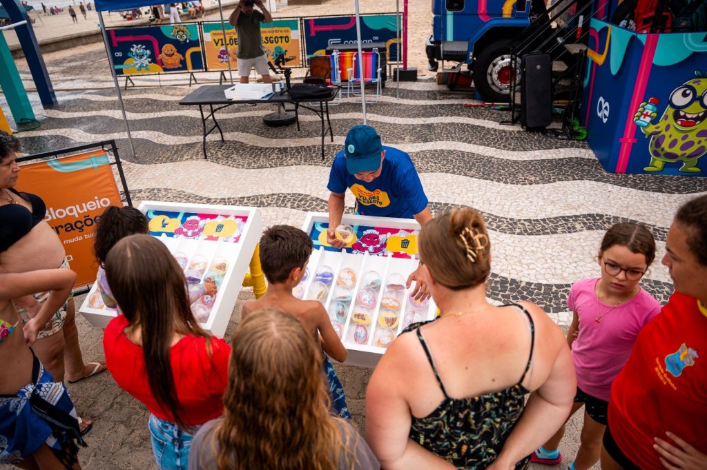 Para celebrar a participação, os “heróis” recebem brindes variados, bolas, chaveiros, brinquedos de praia e tatuagens educativas, que funcionam como selos simbólicos de cidadãos conscientes que combatem os vilões do esgoto e cuidam da água.