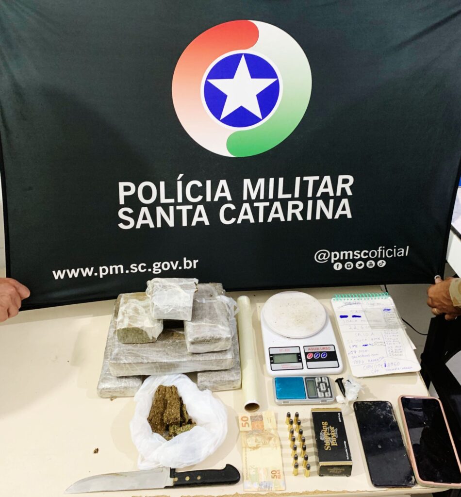 Durante a abordagem a guarnição do 12 BPM encontrou inicialmente certa quantia de maconha, que após a pesagem foi confirmado se tratar de 19kg da substância; além de 06 munições de calibre .32, sendo que os abordados foram identificados como J.F.O e M. A. G. O primeiro informou residir na cidade de Bombinhas e que tinha mais drogas em sua residência. Diante de tal informação, a guarnição do tático do 31 BPM foi até o endereço repassado, e na primeira quitinete à esquerda fez contato com uma pessoa do sexo feminino, de nome E.M. S., que relatou ser esposa de J.F.O. e que o mesmo não estaria em casa. A mulher foi informada da prisão de seu esposo pelo tráfico de drogas e que ele havia relatado que havia mais droga na residência, fato confirmado pela esposa que autorizou o acesso da Guarnição para apreensão do material ilícito. Ela apresentou uma mochila onde havia grande porção de maconha. Na busca residencial foram apreendidos os seguintes itens: 3,164 kg de maconha, separado em 4 porções grandes, 3 porções médias e várias porções menores; 3 porções de cocaína; 14 munições de calibre .32 intactas; pequena quantia em dinheiro; 2 balanças de precisão; 1 caderno de anotações do tráfico; 2 aparelhos de telefone celular; 1 faca e 1 rolo de papel filme.
