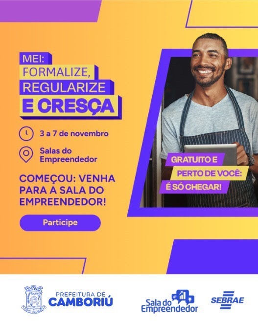 Em parceria com o Sebrae/SC, a Prefeitura de Camboriú realiza entre os dias 3 a 7 de novembro, Campanha de Regularização e Crescimento para Microempreendedores Individuais (MEIs). A iniciativa faz parte da Semana de Atendimento nas Salas do Empreendedor, que irá ocorrer simultaneamente em mais de 185 municípios catarinenses com objetivo de orientar, regularizar e impulsionar o crescimento dos pequenos negócios. Em Camboriú, a Sala do Empreendedor está localizada na Secretaria de Desenvolvimento Econômico, na Rua Manoel Anastácio Pereira, n°67 – Centro. Seu horário de funcionamento é das 12h às 18h, de segunda a sexta-feira.
