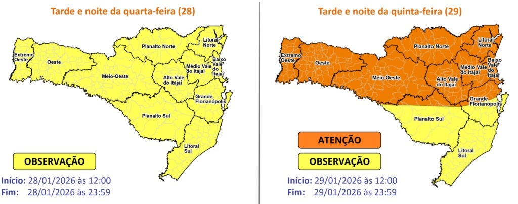 Amanhã, quinta-feira (29), os temporais se intensificam com chuva intensa, acompanhados por raios, rajadas de vento e eventual queda de granizo, com destaque para o Grande Oeste, Planalto Norte, Vale do Itajaí, Litoral Norte e Grande Florianópolis. Neste dia, o risco é ALTO para ocorrências associadas a alagamentos, enxurradas e destelhamentos.