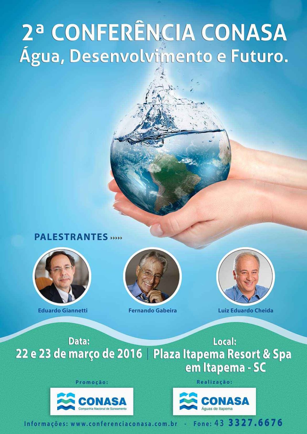 Em alusão ao Dia Mundial da Água, a CONASA Águas de Itapema realiza nesta terça (22) e quarta-feira (23) a 2ª Conferência CONASA para discutir “Água, Desenvolvimento e Futuro’, no Plaza Itapema Resort. O evento pretende reunir lideranças e comunidade para discutir temas relevantes para a qualidade de vida e sustentabilidade ambiental.