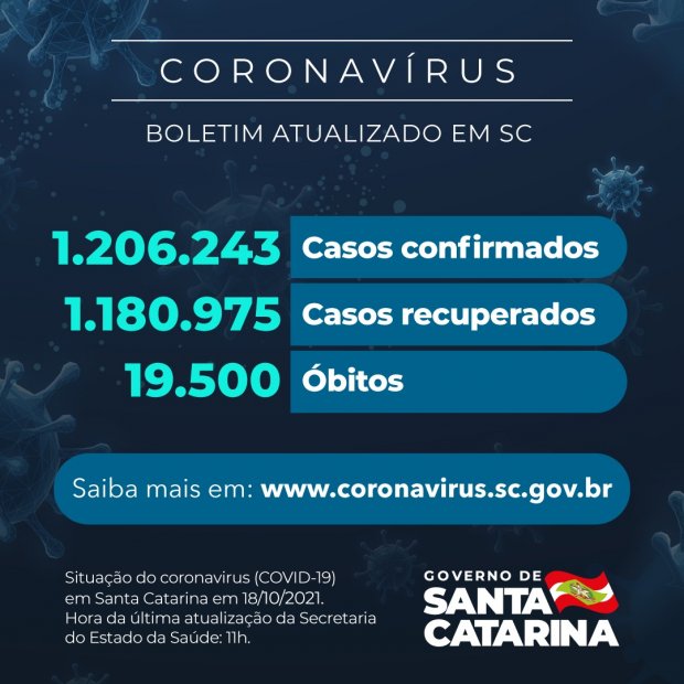 O Governo do Estado informou que há 1.206.243 pacientes com teste positivo para Covid-19 em Santa Catarina, dos quais 1.180.975 estão recuperados e 5.768 permanecem em acompanhamento. O dado foi divulgado nesta segunda-feira, 18. Desde o início da pandemia, 19.500 óbitos foram causados pelo novo coronavírus. Esses números colocam a taxa de letalidade em 1,62%.