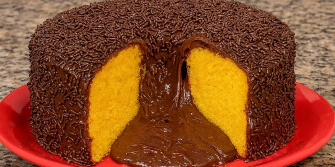 - Despeje o brigadeiro cremoso dentro da cavidade central e deixe transbordar, criando o efeito “vulcão”.