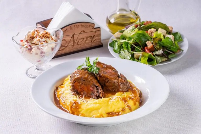 Do Neri – Bife a rolê da Nina: a ex-primeira-dama da cidade serve de inspiração para este menu do Restaurante Do Neri. Foi Nina Plautz quem revelou que o prato preferido do antigo prefeito era um bife a rolê, que chega para o Degusta Camboriú numa releitura, recheado com bacon e linguiça defumada local e cenoura, musseline de batata baroa ao próprio molho com toque de parmesão. De entrada, um mix de folhas com molho de morangos, balsâmico e azeite com croutons temperados. Os morangos, aliás, aparecem também na sobremesa, numa taça com creme belga, calda da fruta, suspiros crocantes e castanhas de caju. A homenagem inclui as frutinhas suculentas que também eram plantadas pelo político. Valor: R$ 76,00.