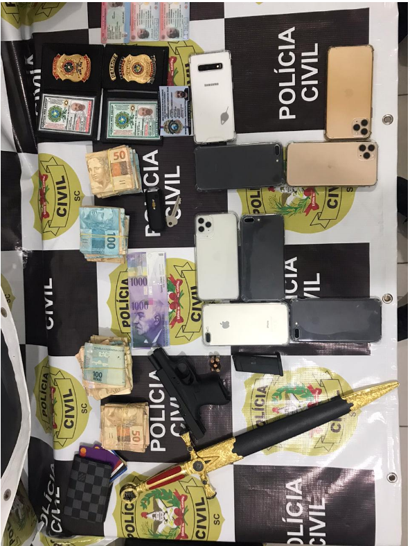 Como o acusado já vinha sendo monitorado, ele acabou sendo preso na cidade de Camboriú e, após isso, foram realizadas buscas em seu apartamento e lá foi localizada uma pistola Glock calibre .380, além de outros materiais, como a vultosa quantia de R$ 38.000,00 (trinta e oito mil reais) em espécie.