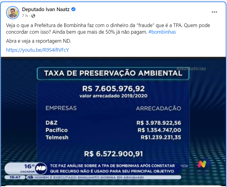 O deputado estadual Naatz acusa nesta nota publicada em sua página do Instagram; “A Assembleia Legislativa de Santa Catarina aprovou em 2021, uma proposição de minha autoria, a Proposta de Emenda à Constituição que proíbe a cobrança de Taxas de Preservação Ambiental em todo o estado” “Veja o que a Prefeitura de Bombinhas faz com o dinheiro da “fraude” que é a TPA”