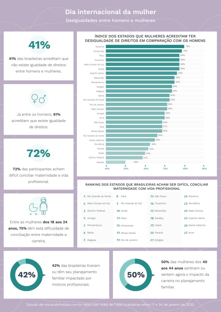 Os dados por estado demonstram que, no Distrito Federal, 78% das entrevistadas encontram dificuldades em conciliar maternidade e carreira. Em Alagoas e na Bahia, o percentual é de 74%. Já em São Paulo e no Rio de Janeiro, é de 73%. E em Santa Catarina, 65% das participantes têm dificuldades em conciliar maternidade e carreira profissional.