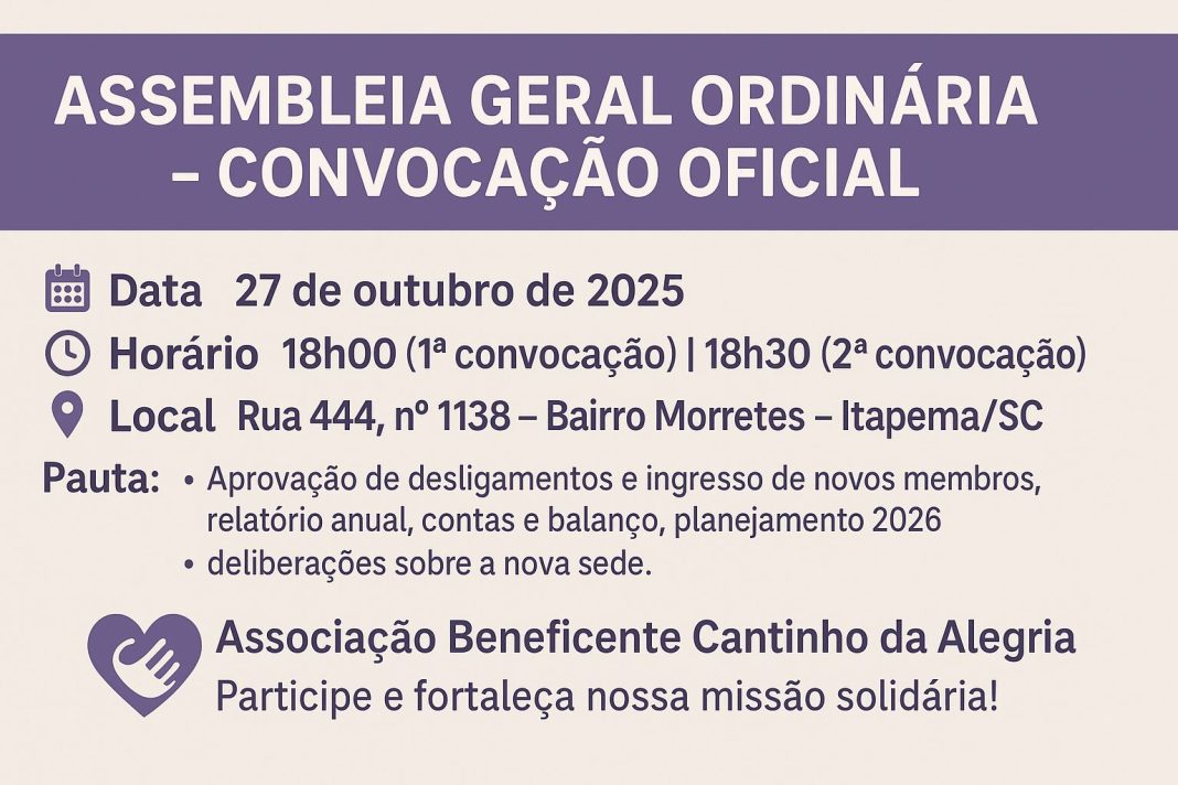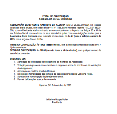 jurídica de direito privado, com sede na Rua 444, N° 1138, Bairro Morretes, Itapema–SC, CEP 88220-000, por sua Presidente abaixo assinada, em conformidade com o disposto nos Artigos 30 e 31 de seu Estatuto Social, convoca todos os seus associados quites com suas obrigações sociais para a Assembleia Geral Ordinária a ser realizada em sua sede, no dia 27 (vinte e sete) de outubro de 2025, com a seguinte Ordem do Dia: