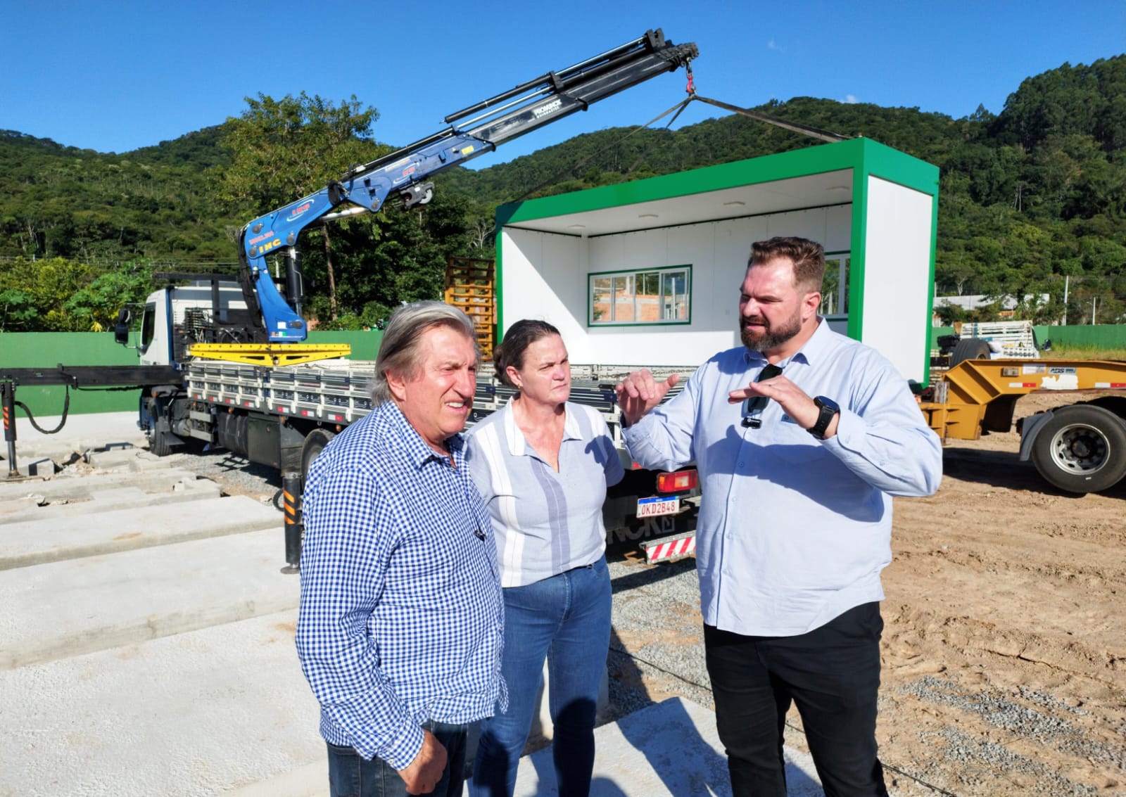 A entrega contou com a presença do prefeito Leonel Pavan e da secretária de Educação, Carin Krug, que acompanharam de perto a chegada da estrutura, símbolo de uma obra marcada pela inovação e eficiência.