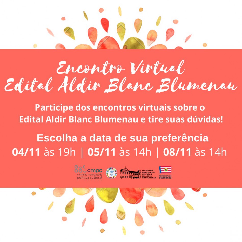 Colaboradores do Conselho Municipal de Política Cultural de Blumenau (CMPC), Secretaria Municipal de Cultura e Relações Institucionais (SMC) e Comitê da Lei Aldir Blanc esclarecem dúvidas sobre as inscrições de projetos no edital. O primeiro dos três encontros virtuais previstos será nesta quinta-feira, dia 4 de novembro, às 19h. Os demais estão marcados para sexta-feira, dia 5, e segunda-feira, dia 8, às 14h. Interessados em participar podem acessar a Plataforma do Zoom pelo link https://linktr.ee/cmpcblumenau.