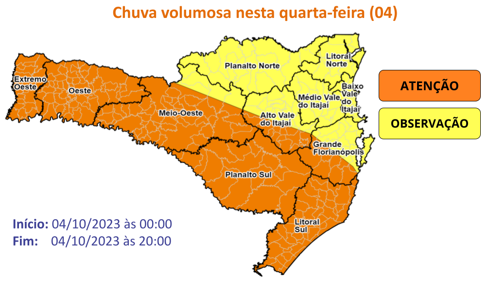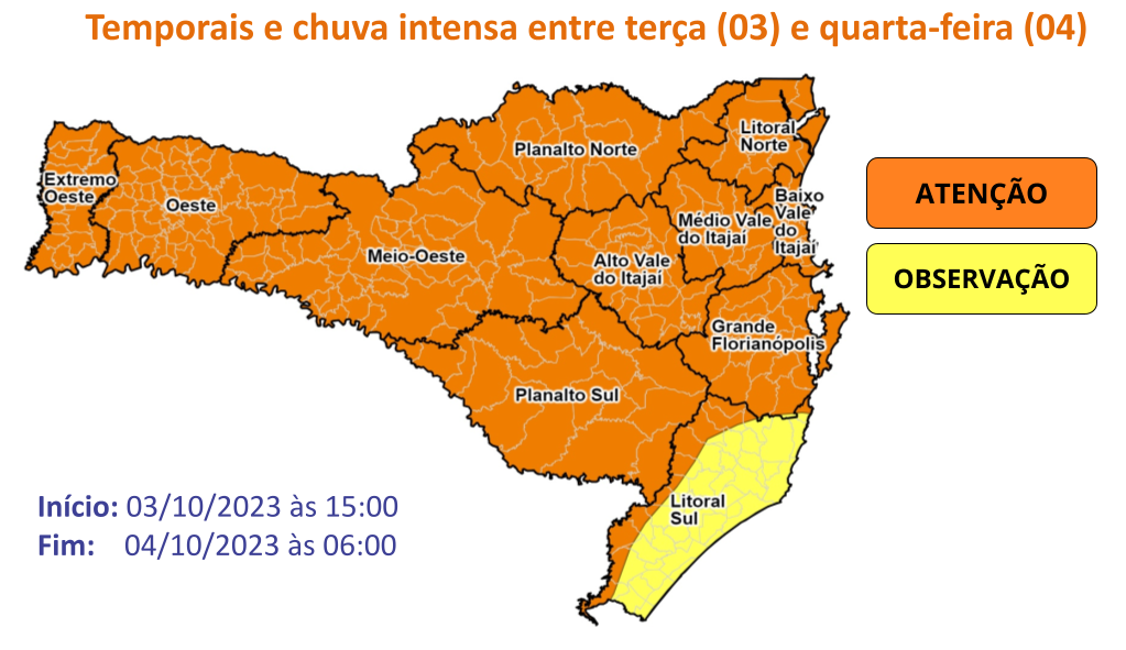 A Defesa Civil de Santa Catarina emitiu dois avisos meteorológicos para o estado: um sobre temporais e o outro sobre chuva volumosa. Estas condições ocorrem devido a uma atuação de frente fria que se aproxima. Entre a tarde desta terça-feira, 3, e a madrugada de quarta, 4, estão previstos temporais em todo o estado, acompanhados de rajadas de vento e chuvas intensas. Nas áreas em laranja do mapa, o risco é alto para ocorrências como destelhamentos, queda de árvores, danos a rede elétrica e alagamentos. Já nas áreas em amarelo o risco é moderado para ocorrências.