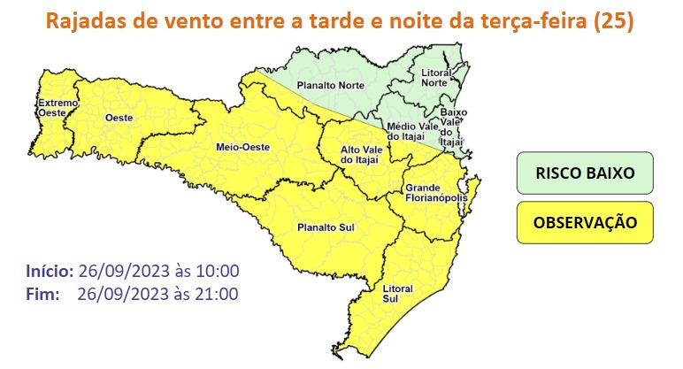 A partir do final da manhã desta terça-feira, 26, o vento do quadrante norte/noroeste ganha força com velocidade média entre 30 e 40km/h e rajadas entre 60 e 80km/h, na área entre o Extremo Oeste e o Litoral Sul e na Grande Florianópolis, à medida que o sistema de baixa pressão ganha força, para no final do dia dar origem a um ciclone extratropical entre o Litoral de Santa Catarina e do Rio Grande do Sul. O risco é baixo na área em verde e moderado na área em amarelo do mapa, para ocorrências associadas a destelhamentos, queda de galhos e árvores.