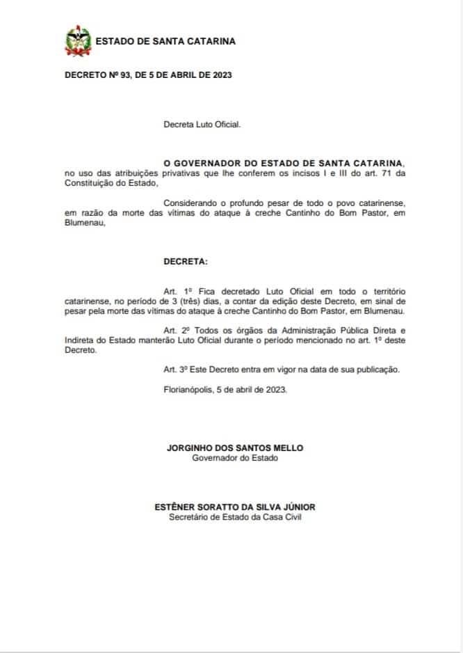 O governo do estado, Jorginho Mello, decretou nesta manhã três dias de luto oficial, considerando o profundo pesar de todo o povo catarinense, em razão da morte das vítimas do ataque à creche Continho do Bom Pastor, em Blumenau.