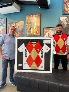O Instituto Internacional Juarez Machado recebeu, no sábado, dia 24, uma peça de grande valor histórico e simbólico para Joinville: uma camisa comemorativa do Joinville Esporte Clube (JEC), criada em 2006, pelo artista Juarez Machado, em celebração aos 30 anos do clube. A doação foi realizada pelo colecionador Diogo Luiz da Costa e passa a integrar o acervo do Instituto, fortalecendo o diálogo entre arte, futebol, memória e identidade joinvilense. A peça representa um marco tanto para a história do JEC quanto para a trajetória artística de Juarez Machado, um dos nomes mais importantes das artes visuais brasileiras.
