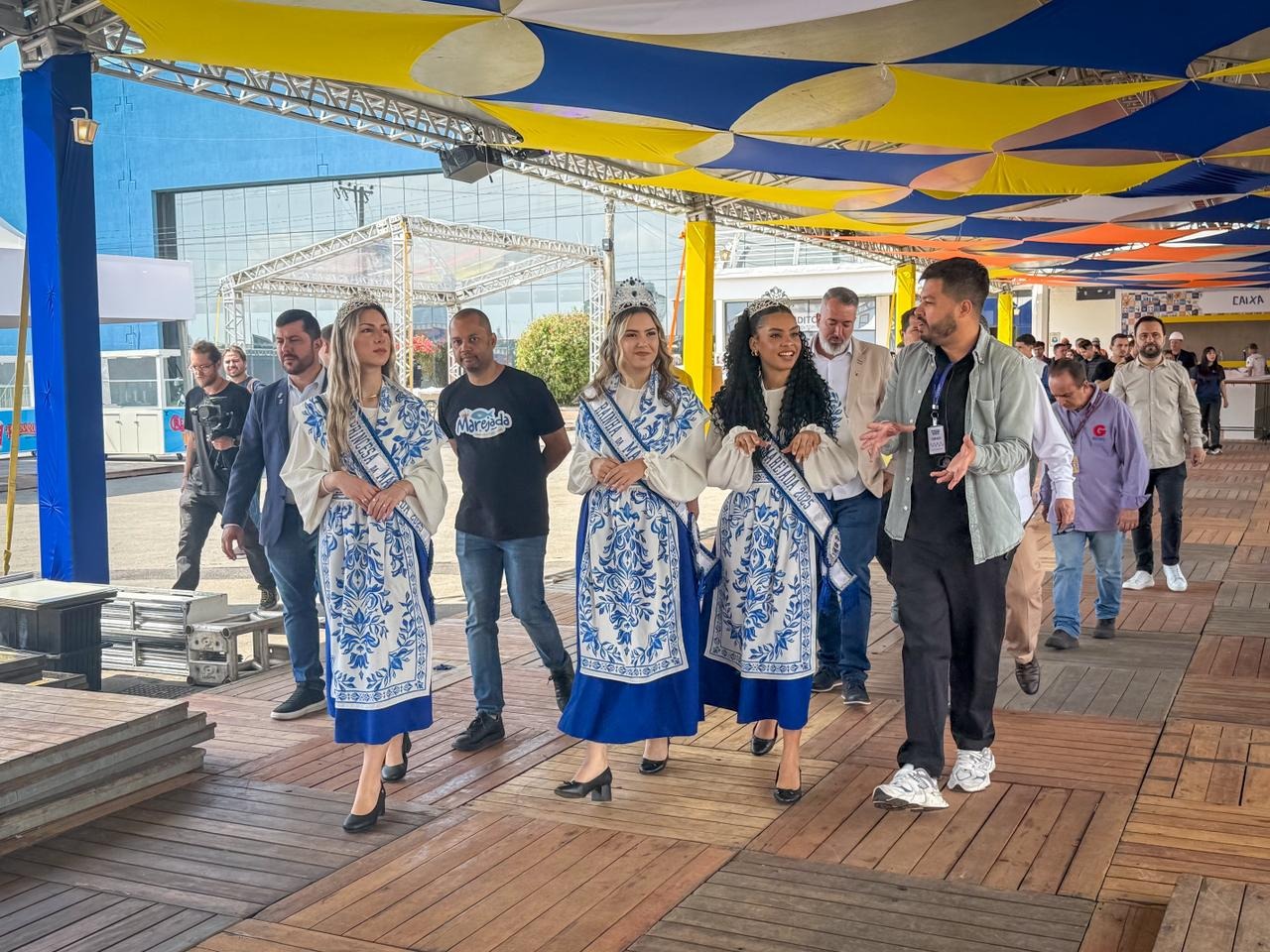 Na imagem o prefeito Robison Coelho com as soberanas da Marejada. A 36ª Marejada contará com 14 restaurantes (com opções veganas, vegetarianas e funcionais), cinco bares, dois palcos, área kids, ambulatório, banheiros masculino e feminino, caminhão de chope, pontos de hidratação, ativações de patrocinadores, parque de diversões com mais de dez brinquedos, central de copos, mesas temáticas, caixas e 35 postos de segurança, tudo distribuído pelo Salão Interno e pela área externa do Centreventos Governador Luiz Henrique da Silveira.