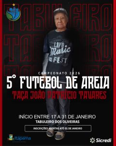O Bairro Tabuleiro dos Oliveiras dará início neste sábado (24), ao 5º Campeonato de Futebol de Areia – Taça João Patrício Tavares – fortalecendo o esporte comunitário e a integração entre os moradores. A competição é organizada pela associação do bairro, com apoio da secretaria de Esportes de Itapema. Os jogos serão disputados na quadra de areia do bairro – que recentemente passou por melhorias e melhor organização – passando a oferecer mais qualidade, segurança e melhor estrutura para atletas e público. O espaço também ganhou um novo parque infantil, o que ampliará as opções de lazer para as famílias da região.