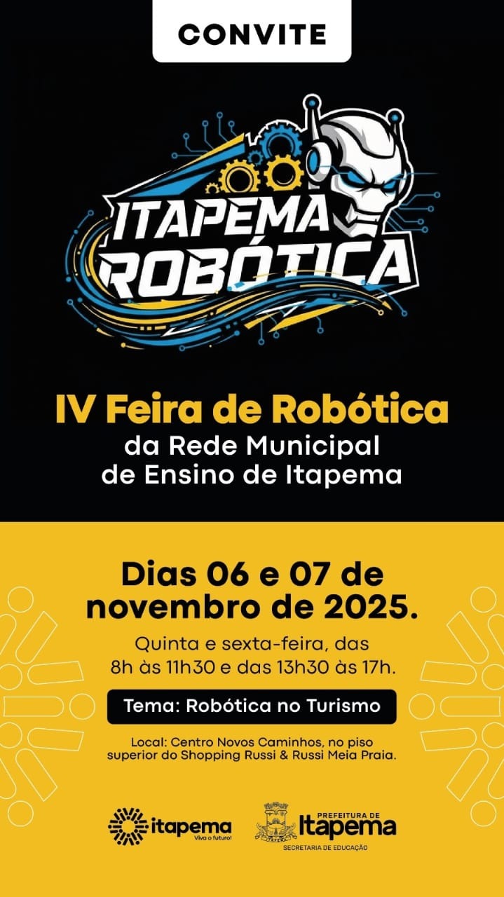A Prefeitura de Itapema, por meio da Secretaria de Educação, realiza nesta quinta (06) e na sexta-feira (07) a abertura da IV Feira e do III Torneio de Robótica da Rede Municipal de Ensino, com o tema “Robótica no Turismo”. O evento acontece no Centro Novos Caminhos, no piso superior do Shopping Russi & Russi Meia Praia, das 8h às 11h30 e das 13h30 às 17h.