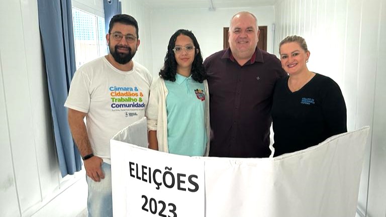 O Presidente do Legislativo (no centro), vereador Jean do Dimar (MDB) acompanhou a experiência das urnas que simulou uma votação real com os alunos da Escola Francisco Vitor Alves. Na foto ao centro, a atual vereadora mirim, Vitória Azevedo Alves, estudante do EMB Francisco, o coordenador da Câmara Mirim, Josué Bordin, e a Gestora de Programas Institucionais, Katiusci Habitzreuter
