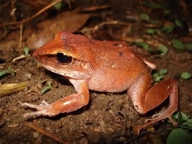 Rã: Haddadus binotatus (conhecida como rã-do-folhiço ou rã-pimenta).