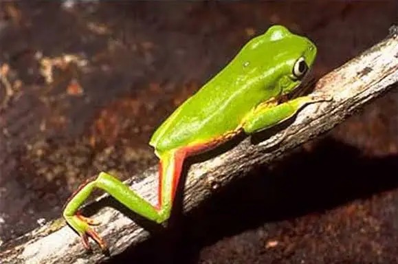 Rã: Phyllomedusa distincta (perereca-das-folhagens).