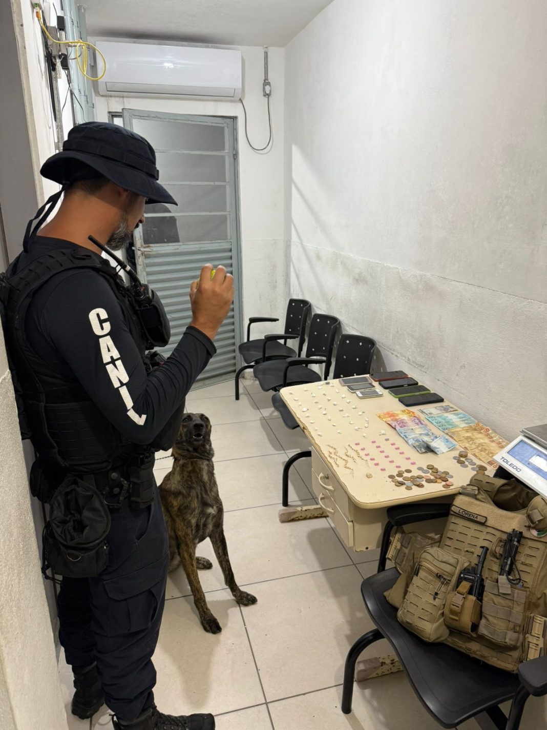 Além disso, outro suspeito foi revistado e, com ele, foram encontrados R$50 em espécie e entorpecentes diversos, incluindo sete gramas de cocaína, 13 gramas de crack e R$180 em dinheiro. Diante do flagrante, a guarnição acionou o canil da Guarda Municipal para apoio na busca por mais substâncias ilícitas.