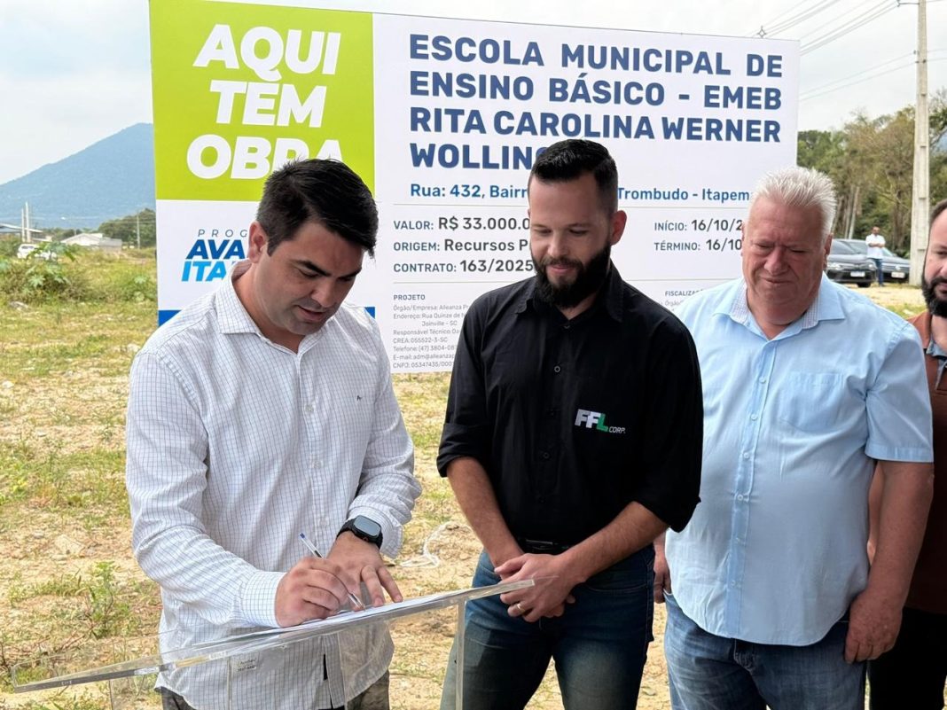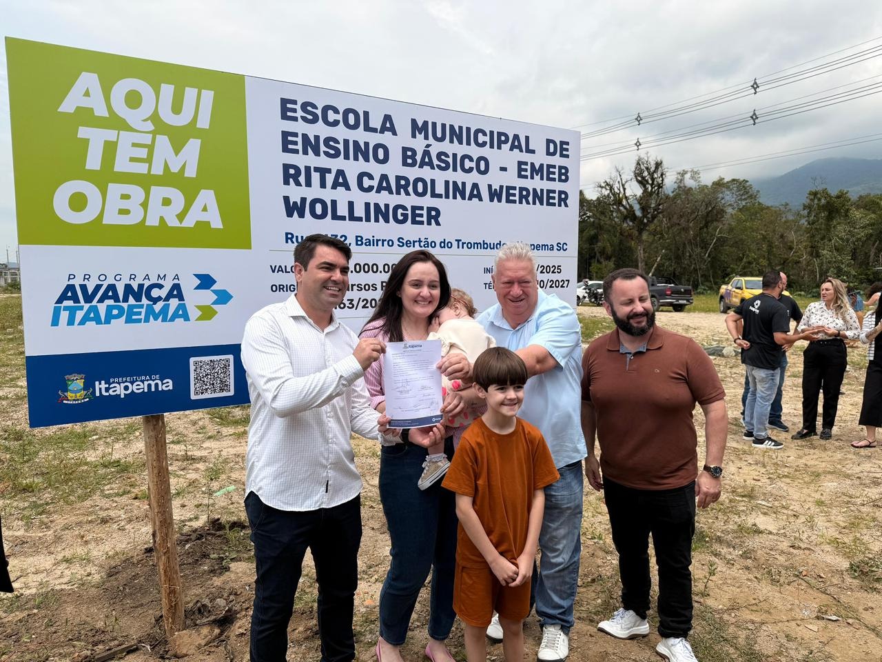 A Prefeitura de Itapema assinou na manhã desta quinta-feira (13/11) a ordem de serviço para a construção da Escola de Referência Rita Carolina Werner Wollinger, no Bairro Sertão. A nova unidade, que vai atender estudantes do 1º ao 9º ano, representa um investimento de R$ 33 milhões de recursos próprios e marca o maior investimento em infraestrutura educacional já realizado na cidade.