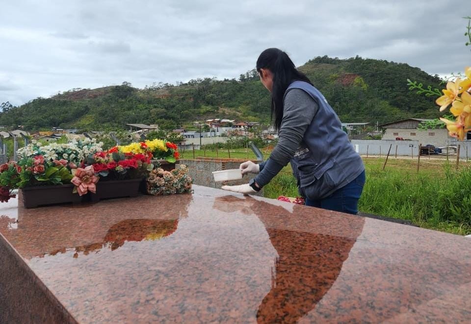 Os Agentes de Combate às Endemias realizaram vistoria no cemitério para prevenção e combate ao mosquito Aedes aegypti. Durante a ação, foram coletadas amostras para análise laboratorial, retirada de plásticos e outros possíveis criadouros do mosquito da dengue e aplicados larvicidas em túmulos com acúmulo de água.
