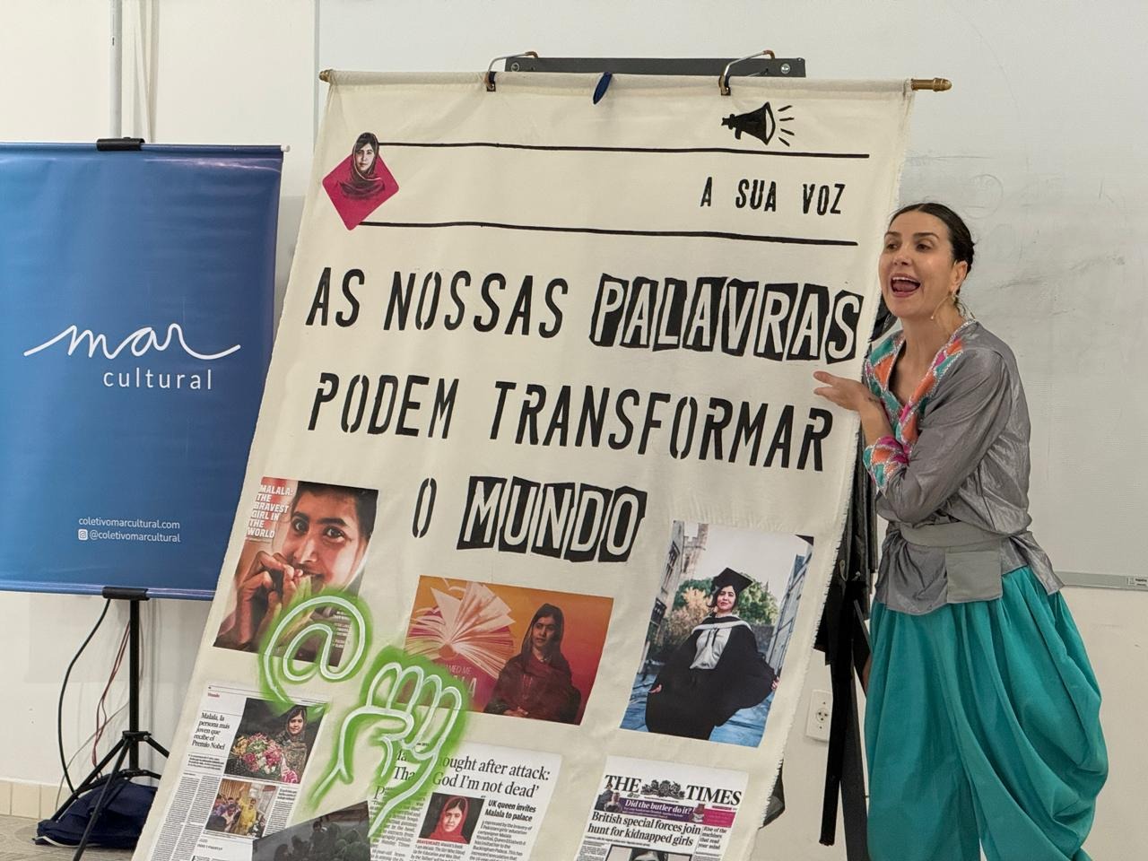 Durante a sessão, crianças do 1º ao 5º ano acompanharam a inspiradora trajetória de Malala Yousafzai, jovem paquistanesa reconhecida mundialmente pela defesa do direito universal à educação. De maneira sensível e envolvente, a atriz Raquel Stüpp interpreta diversos personagens e conduz o público por uma narrativa que destaca coragem, equidade e transformação social.