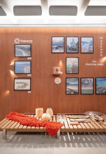 O espaço reúne desde uma rede de pescador emprestada por moradores, até quadros, bordados, mantas de crochê, boi de mamão, cerâmicas e fotos antigas de moradores da cidade. Na parede conceitual estão imagens de pontos turísticos, frases escritas à mão e referências à pesca da tainha. O teto e o piso em concreto aparente homenageiam a força da construção civil, outro símbolo do crescimento da cidade.