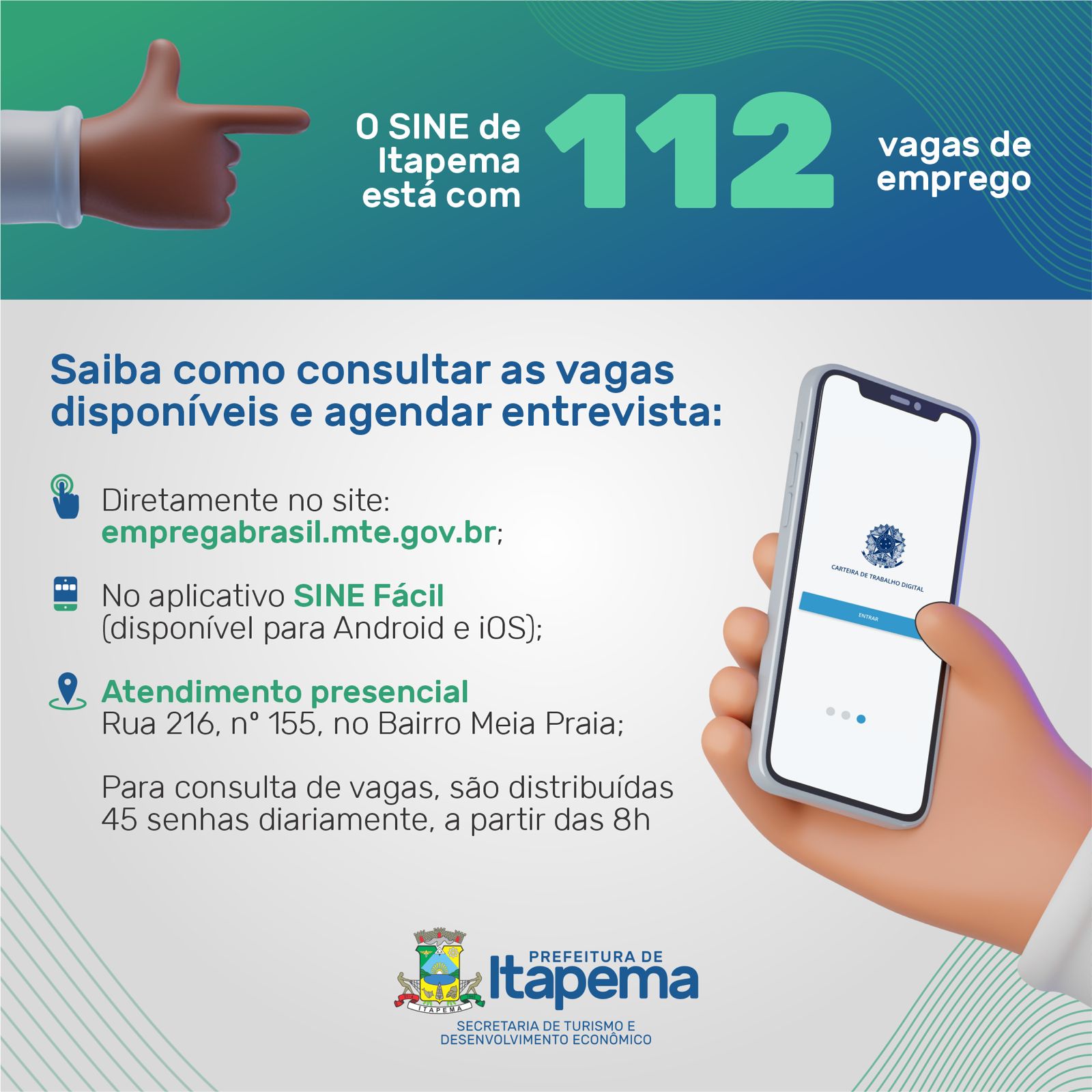 O Sine de Itapema iniciou a semana com 112 vagas de emprego disponíveis, em diferentes áreas de atuação. Os interessados podem consultar as oportunidades e agendar entrevista diretamente no site: empregabrasil.mte.gov.br ou no aplicativo SINE Fácil (disponível para Android e iOS).