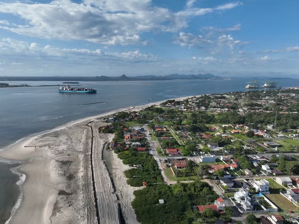 Maior obra de alargamento de praia do Brasil, em Itapoá (SC) já alcançou 58,5% de progresso e ampliou 5 km da orla. Intervenção começou em outubro de 2023 e prevê a ampliação de 8,8 km de faixa de areia até o fim do ano. Mais de 3,4 milhões de metros cúbicos de areia foram depositados; sedimento foi retirado da Baía da Babitonga. Obra utiliza uma draga de 166,5 metros, que já realizou 394 operações para transportar areia. Serviço vai ampliar as orlas das praias Figueira do Pontal, Pontal do Norte e Princesa do Mar.