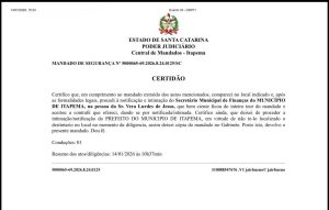 De acordo com a certidão judicial, o prefeito de Itapema não foi localizado no momento da diligência, razão pela qual o oficial de Justiça deixou cópia do mandado no Gabinete do Prefeito, garantindo a ciência institucional do Executivo municipal.