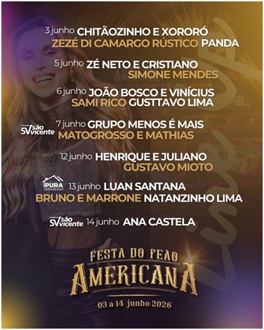 “É uma alegria imensa chegar à 38ª edição da Festa do Peão de Americana com uma programação tão grandiosa e especial. Preparamos cada detalhe com muito carinho para entregar ao público uma grade artística maravilhosa, à altura da história e da importância do nosso evento. Mais do que grandes shows, a Festa do Peão de Americana é um espaço seguro, organizado e pensado para as famílias, onde tradição, diversão e emoção caminham juntas. Estamos prontos para receber o público e viver mais uma edição inesquecível”, destaca Beto Lahr, presidente da Festa do Peão de Americana.