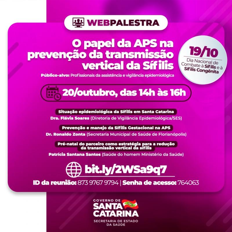 A Prefeitura de Florianópolis, por meio da Secretaria de Saúde, irá participar de um evento estadual sobre o papel da Atenção Primária à Saúde, na prevenção da transmissão vertical da Sífilis. No evento online, o Dr. Ronaldo Zonta falará sobre a prevenção e manejo de sífilis gestacional, ou seja, passada de mãe para filho. A ação acontecerá nesta quarta-feira, 20 de outubro, das 14h às 16h, para profissionais de saúde de todo estado.