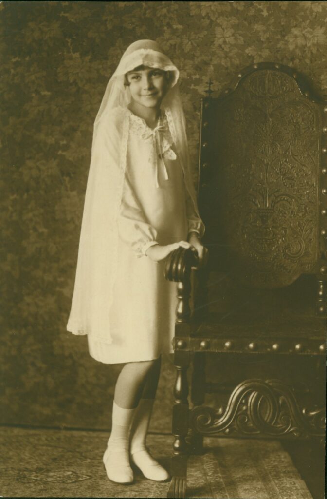 A Primeira Comunhão ou Primeira Eucaristia é o ato religioso da Igreja Católica no qual é celebrada a primeira vez que a criança cristã católica irá receber o Corpo e o Sangue de Cristo (sob a forma de pão e vinho). Trata-se de um dos Sacramentos da Igreja no qual é representado “o próprio sacrifício do Corpo e do Sangue do Senhor Jesus, que Ele instituiu para perpetuar o sacrifício da cruz no decorrer dos séculos até ao seu regresso”. Como também um rito de passagem da infância para o mundo adulto. Na imagem, observa-se a indumentária da criança: uma menina em seu traje, lembrando a passagem da infância para um novo estágio da vida simbolizada pela vestimenta que lembra a noiva, enquanto que os meninos em seus ternos lembram o noivo. (Fonte: Secretaria Municipal de Cultura / Arquivo Histórico José Ferreira da Silva / Ehmke, Clarice. Namorar e casar: Perspectivas de casamento na década de 1950. Revista Blumenau em Cadernos – tomo XLV – N.01/02 – Janeiro/Fevereiro – 2004. p.78-93/ Acervo Iconográfico: Fotos sem identificação – Diversos – Crianças)