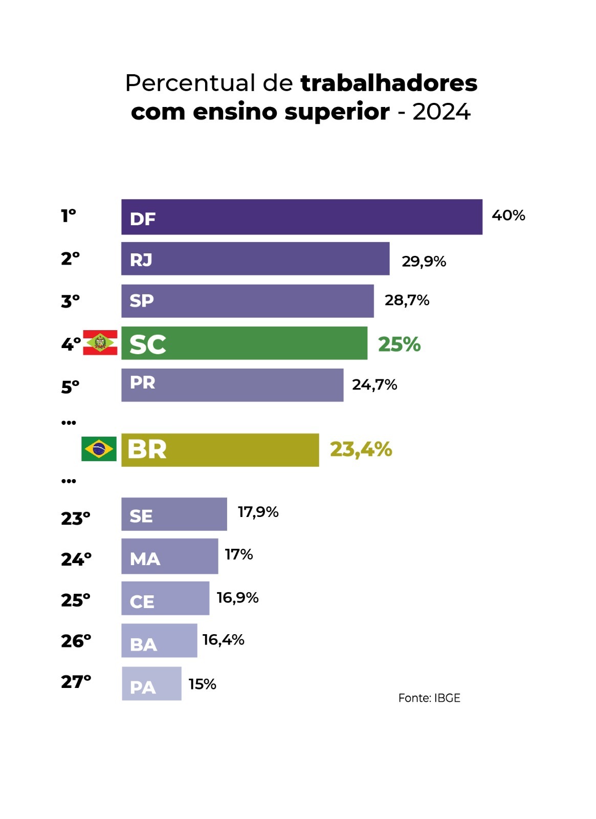 O ranking nacional de trabalhadores com ensino superior é liderado pelo Distrito Federal (40%). Na sequência aparecem Rio de Janeiro (29,9%) e São Paulo (28,7%). Santa Catarina (25%) é o quarto colocado, à frente dos vizinhos Paraná (24,7%) e Rio Grande do Sul (22,6%).